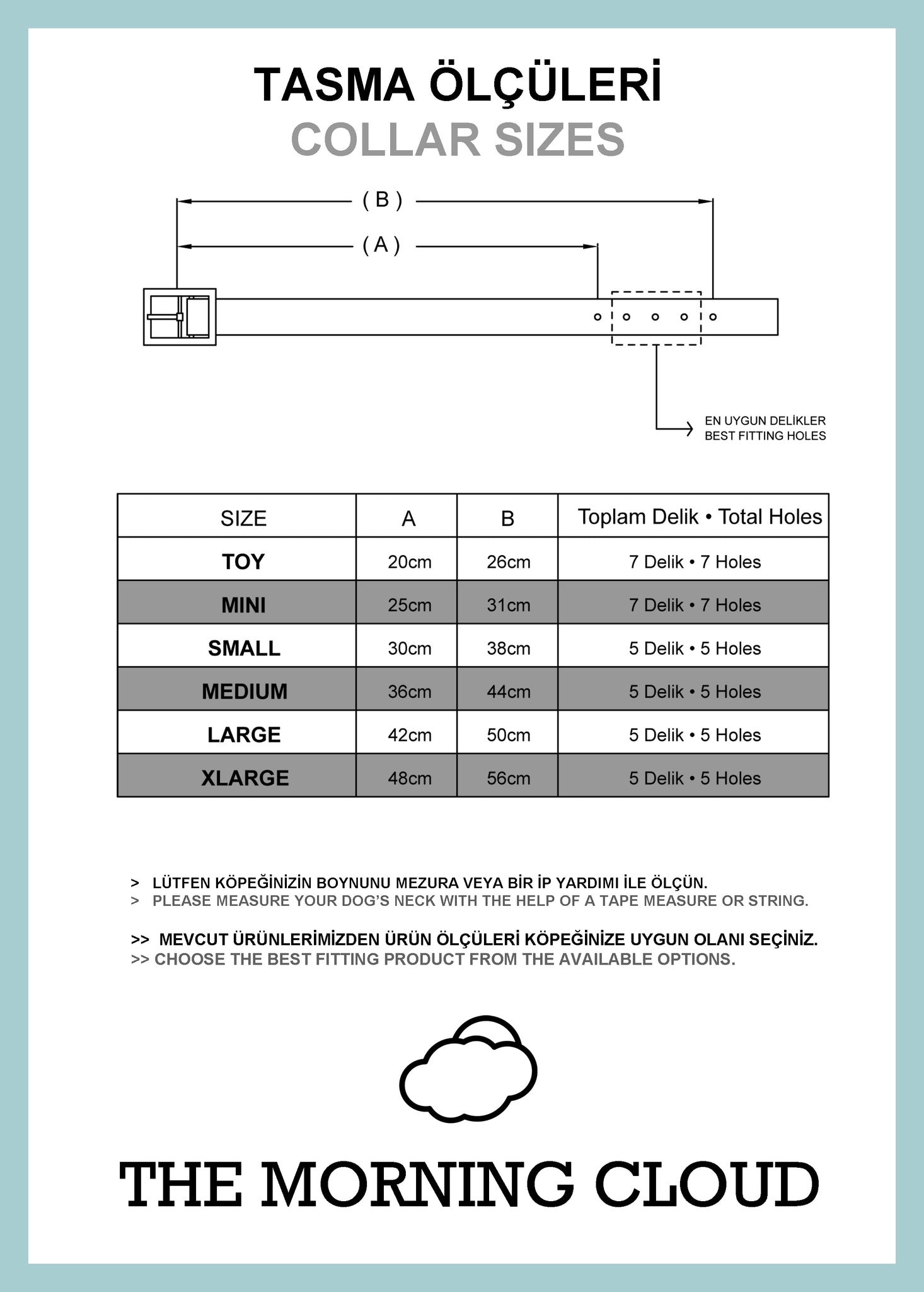 Seçeceğiniz tasmanın ara deliklere gelmesini tavsiye ederiz. Ölçünüz en son deliğe denk gelirse bir büyük ebat veya ilk deliğe geldiyse bir küçük ebatlı ürünü almanızı öneririz.